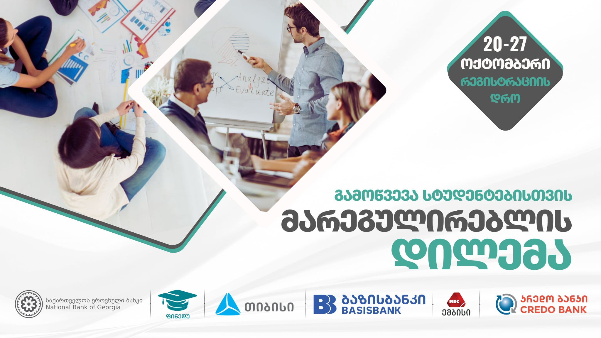 ახალგაზრდებში ფინანსური განათლებისა და საფინანსო ინტიტუტების შესახებ ცნობიერების ამაღლების მიზნით საქართველოს ეროვნული ბანკისა და მისი ფინანსური განათლების პლატფორმა "ფინედუ-ს" ორგანიზებით, ასევე, სს "ბაზისბანკი" (საიდენტიფიკაციო ნომერი: 203841833), სს "თიბისი ბანკი" (საიდენტიფიკაციო ნომერი: 204854595) , სს „მიკრობანკი ემბისისა“ (საიდენტიფიკაციო ნომერი: 404967078) და სს „კრედო ბანკის“ (საიდენტიფიკაციო ნომერი: 205232238) მხარდაჭერით ცხადდება კონკურსი სახელწოდებით - „მარეგულირებლის დილემა“ (შემდგომში - "კონკურსი").