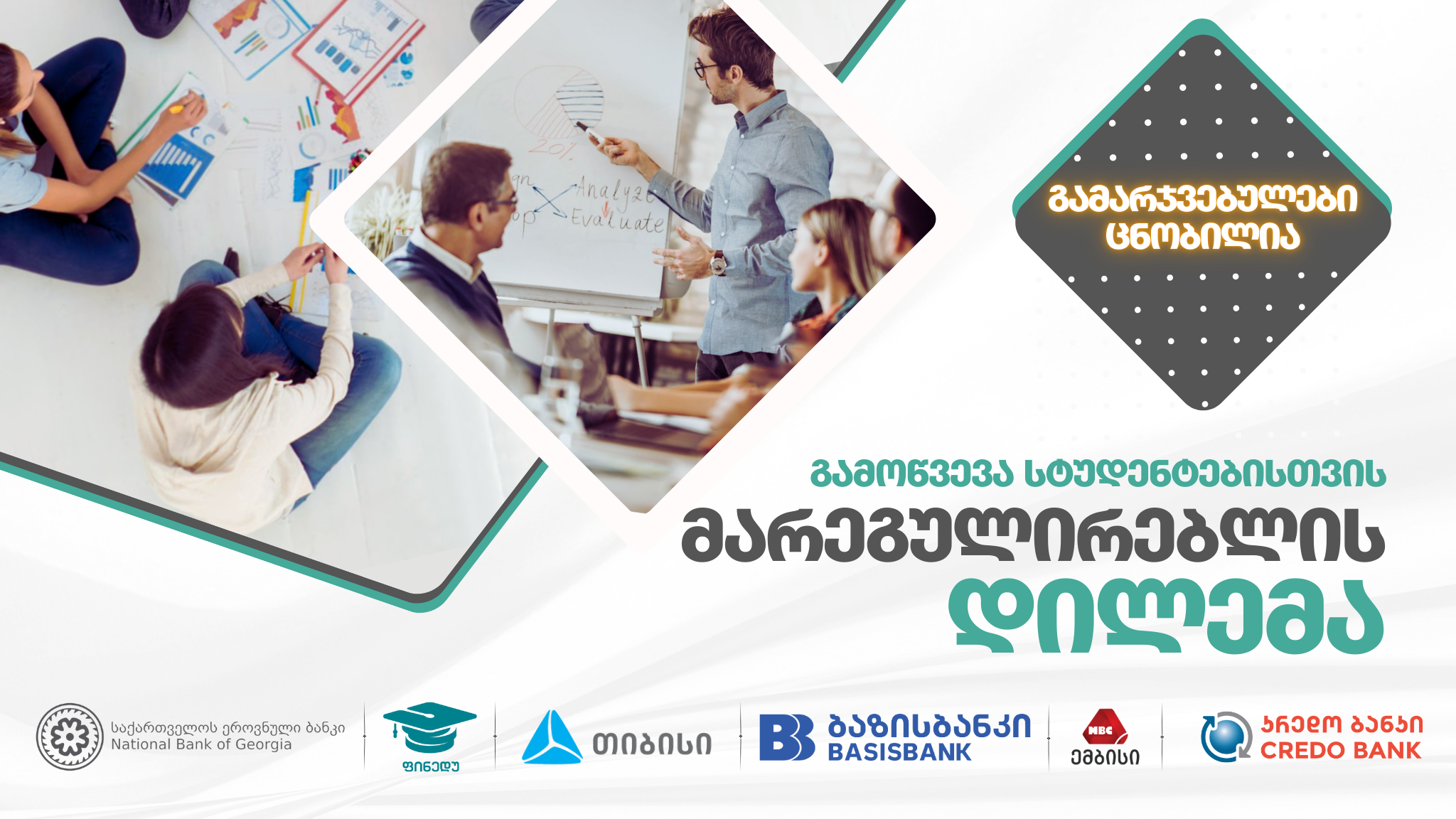 კონკურსი ფინანსური განათლების ეროვნული სტრატეგიის ფარგლებში ეროვნული ბანკის ფინანსური განათლების პლატფორმა "ფინედუს" (www.finedu.gov.ge) ინიციატივით დაიგეგმა და ბაზისბანკის, თიბისი ბანკის, მიკრო ბანკი ემბისისა და კრედო ბანკის მხარდაჭერით ჩატარდა.